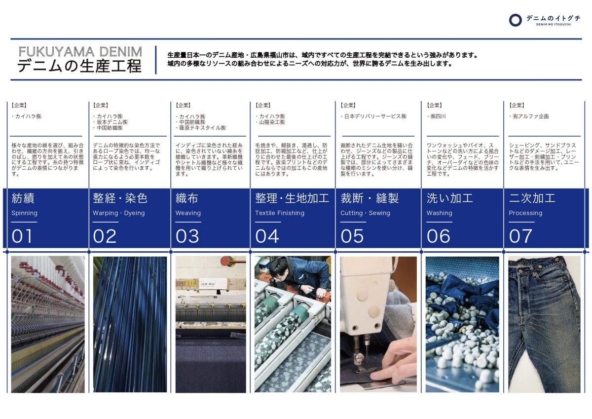 出展は、カイハラ株式会社、合資会社橘高兄弟商会、坂本デニム株式会社、篠原テキスタイル株式会社、中国紡織株式会社など、福山を代表するデニム企業が一堂に会します。
